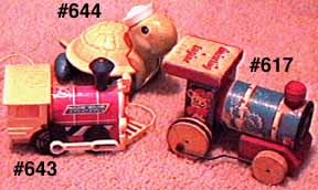 - # 643 - Pull Toy: "Toot-Toot Engine" (Photo) 1964-1987. Train engine makes "chug-chug" sound when pulled. Early version had blue wooden wheels and black smoke stack, and the model number is listed in small print by the cow catcher. Later version had black plastic wheels and blue smokestack, and the model number is just in front of the cab. (See also #642 Dinkey Engine, #642 Smokie Engine, #641 Toot Toot Engine, and finally the commemorative edition #6575). Accessories: None.