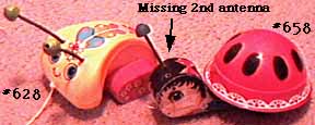- # 658 - Pull Toy: "Lady Bug" (Photo) 1961-1963. Shell turns and clicking sound as toy is pulled. 2 blue antennae. Accessories: None.