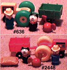 - # 636 - Little People (Smaller Series): "Farm Friends" (Photo) 1983-1984. Green tractor and yellow cart (or vise versa). Accessories: Tall blue farmer (yellow cowboy hat, yellow triangle scarf); Lucky (dog) with red collar; red chicken (rooster). Variation: Orange triangle scarf.