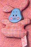 - # 654 - Nursery Toy: "Soft Shakes" Rattle - Bunny (Photo) 1982-19?? (seen in '89 catalog). Cloth body bunny with blue plastic rattle face (pink nose and cheeks). Pink velour back, white front with thin pink, blue and green crossed stripes. Accessories: None.