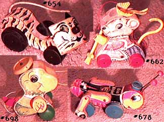 - # 654 - Pull Toy: "Tawny Tiger" (Photo) 1962-1963. Tiger with square face, makes rachet sound and swings head side to side when pulled. Accessories: None.