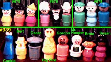 - # 675 - Little People (Smaller Series): Little People Assortment - Circus Clowns (Photo) 1984-1990. Set of 3 play figure Circus Clowns. Accessories: Purple with yellow cone hat (+ + eyes); lime green with blue top hat; orange body with black felt hat and blue or yellow scarf (+ + eyes). Purple clown was replaced by a red in '89.