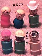 - # 677 - Little People (Smaller Series): Little People Assortment - Farm Family (Photo) 1984-1990. Set of 3 play figure Farmers. Accessories: Green dad (tall white 10 gal. cowboy hat, yellow scarf); red mom (blonde ponytail); blue girl (blonde sculpted bob). Variation: '84 and '86 dealer's catalogue shows yellow girl with black sculpted bob, '89/90 catalogs show red mom with blonde bun.