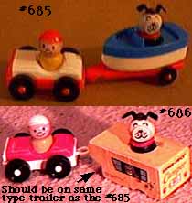 - # 685 - Little People (Smaller Series): "Car and Boat" Set (Photo) 1968-1969. Red and white car with C-shaped trailer hitch on back (or blue and white car), and white or red V shaped boat trailer with hitch in front. Blue and white (or red and white) boat with 2 holes in the bottom. '68 version of car has rivets in bottom, '69 does not. Accessories: Straight-sided yellow boy with red (or blue or white) front-facing cap; straight-sided Lucky (dog) with collar color matching boy's cap (normally).