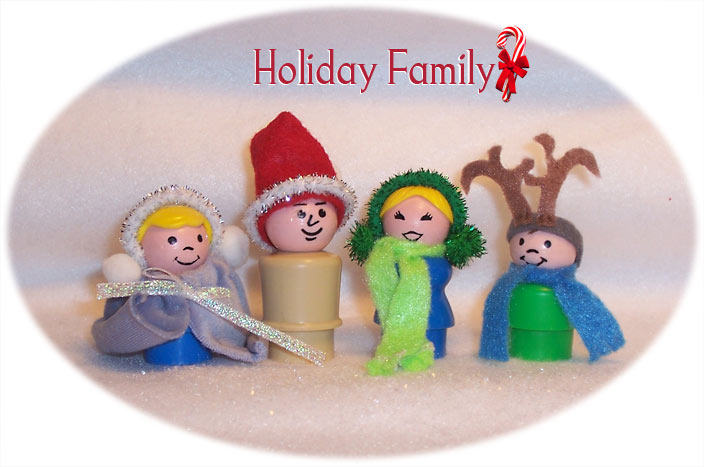 Holiday Family Set - This adorable Holiday Family is dressed for a winter wonderland! The set includes a dad with a santa hat, a mom with ear muffs and a scarf, a son with reindeer antlers and scarf, and a daughter with ear muffs and a soft cape. All holiday costumes are completely removable to properly preserve the toy. The Holiday Family Set includes the following: